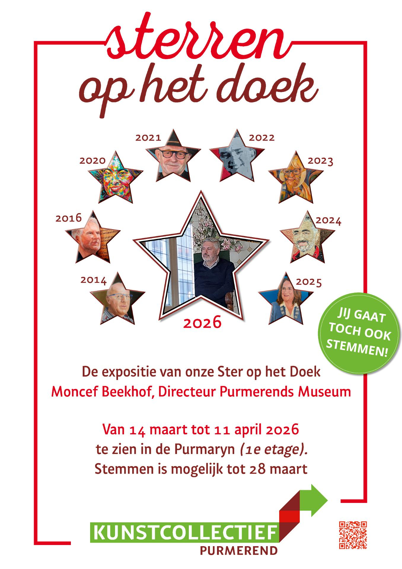 Vanaf zaterdag 14 maart schitteren de portretten van museumdirecteur Moncef Beekhof op de eerste verdieping van De Purmaryn. Achttien kunstenaars van Kunstcollectief Purmerend namen deel in het kader van de negende editie van het Purmerendse Sterren op het Doek. Ze gingen aan de slag met potlood, penseel en hun eigen unieke blik. Het resultaat? Een verrassende en veelzijdige serie tekeningen en schilderijen die je absoluut gezien moet hebben.