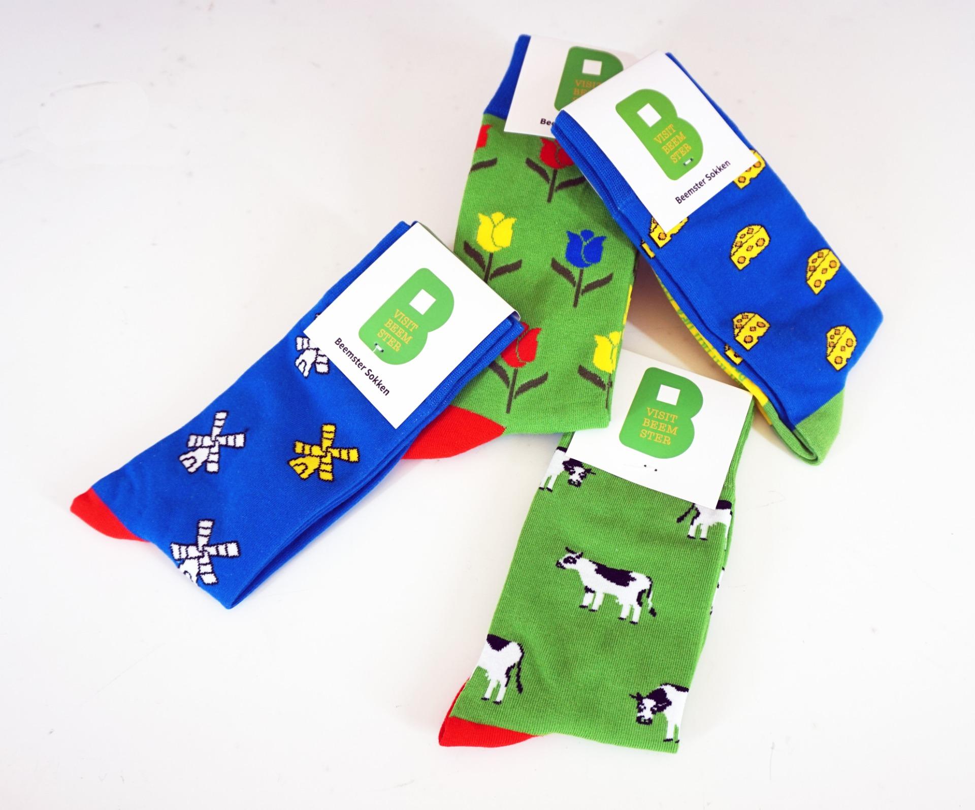 Beemster sokken Beemster sokken met kaas (blauw) en de tekst 'Beemster van top tot teen', met koeien (groen) en de tekst 'Beemster ten voeten uit', met molens (blauw) en de tekst 'Droge voeten in de Beemster' en met tulpen (groen) en de tekst 'Doe als een Beemster tulp en ga uit je bol'. Maat 36/40 en 41/45. |