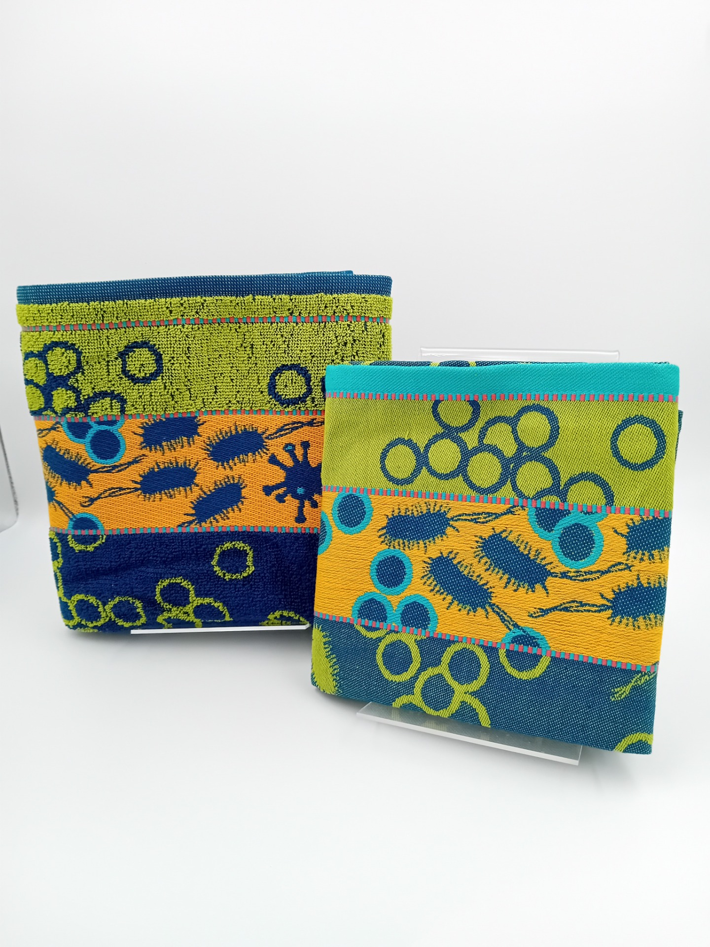 Keukensets van Mariëtte Wolbert Bella Salmonella Het advies om elke dag een schone theedoek te gebruiken, bracht Mariëtte ertoe bacteriën in de keuken te onderzoeken. Ze heeft er enkele verwerkt in haar ontwerp. De keukenset bestaat uit een thee- en een keukendoek. Theedoek 65x65 cm 100% katoen. Keukendoek 60x60 cm 100% katoen. Gefabriceerd in Europa. |