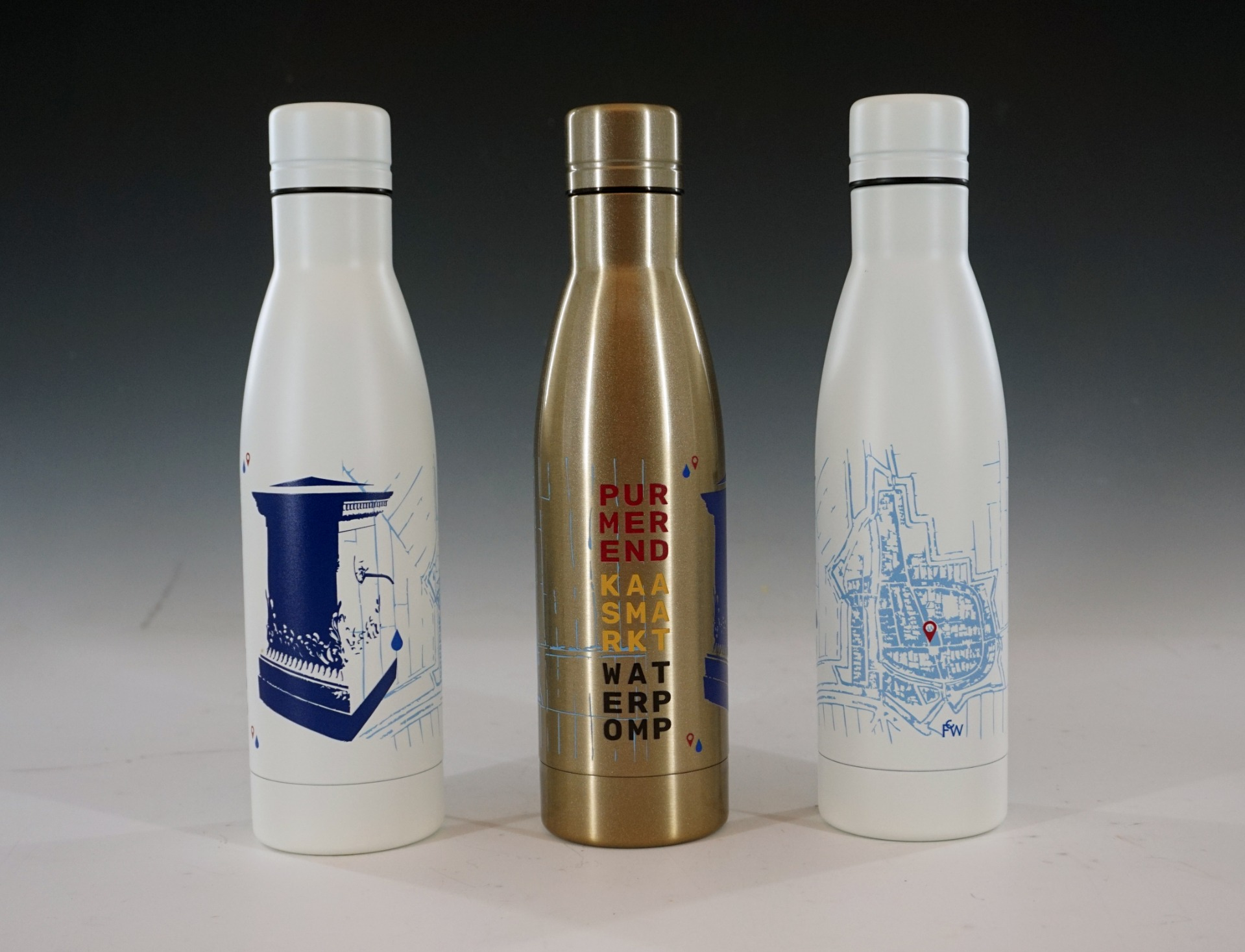 Roestvrijstalen geïsoleerde fles 500 ml Onlangs is door de gemeente Purmerend een getrouwe replica van de historische waterpomp geplaatst op de Kaasmarkt. De openingshandeling werd verricht door het vullen van een speciaal ontworpen waterfles met water uit de pomp. Deze waterfles is te koop in de VVV|Museumwinkel. Daarop staat zowel een afbeelding van de waterpomp, alsook een historische plattegrond van Purmerend. De 500 ml koperen vacuüm geïsoleerde fles is verkrijgbaar in de kleuren wit en brons. De fles houdt je drankjes 12 uur warm of 24 uur koud, is dubbelwandig en gemaakt van roestvrij staal met vacuüm isolatie en een koperen binnenwand. Wordt geleverd in een geschenkdoos. |